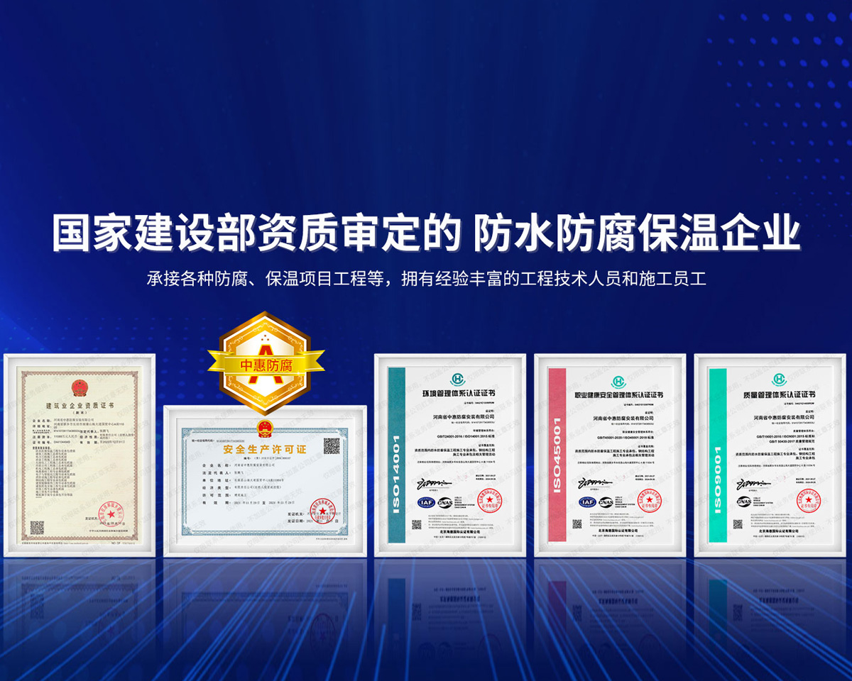 公司經營范圍:防水防腐保溫工程;消防設施工程;建筑裝修裝飾工程;建筑機電安裝工程;電力工程;建筑工程;石油化工工程;工業清洗工程;油罐清洗工程;鋼結構工程;環保工程;模板腳手架工程;電纜防火封堵、防污閃噴涂、外墻外保溫工程;各類施工勞務作業;設備維修、船舶鉚焊、涂裝;電力工程材料、建材、防水材料、防火材料、防腐保溫材料銷售,并相繼通過了GB/T19001-2008idtISO9001:2008GB/T50430-2007質量管理體系認證證書。GB/T24001-2004idtISO14001:2004環境管理體系認證證書。GB/T28001-2011idtOHSAS18001:2007職業健康安全管理體系認證證書。公司是中國防腐蝕于防護協會、中國施工企業管理協會、電力協會和中國鋼結構防水協會會員單位。 公司的經營業務涵蓋了石油、化工、電力、冶金、煤炭、船舶、國防、燃氣、水利、環保、交通運輸、航空及國防軍工和輕紡市政等行業的防腐保溫絕熱設備。鋼結構安裝、防火、防水、金屬噴鍍、聚脲噴繪、陰極保護、防滲透堵漏、玻璃鋼及各種磚版材料襯里、橡膠襯里、煙氣硫和耐酸溶劑腐蝕等工程施工。公司連續十年榮獲“省市先進施工企業”“安全生產先進單位”“重合同,守信用企業”和“AA***資質企業”的稱號。2000年被命名為市級文明單位,2002年被國家工商行政管理局命名為“重合同,守信用的企業”、被中國工業防腐蝕技術協會命名為“防腐蝕企業,能源節約及環境保護領域有豐富的經驗和***的業績。工程一次交驗合格率100%。其中攀枝花鋼鐵公司煉鐵廠四號高爐及熱風爐防腐工程、上海寶鋼公司煤氣柜防腐工程、撫順石油一廠裝置防腐項目、齊魯石化公司稀烴廠高塔防腐工程、吉林化學工業公司煉油廠油罐防腐工程、天津石化熱電廠六號爐頂棚聯絡管保溫工程、大慶油田(太倉)力神泵業工程、中國化學工程第十一建設工程、中原油田勘探局工程、中國石化銷售有限公司華北分部、魯皖輸油管道工程、貴州開磷息烽合成氨工程、陜西黃陵煤化工程、中國石油天然氣西部管道塔里木輸油工程、邯鋼集團邯寶鋼鐵公司煉鐵工程、德州供電工程、吉寶(南通)船廠工程,偃師華潤熱力工程、鄭州熱力總公司。 河南省中惠防腐安裝有限公司愿以豐富的施工經驗,***的技術,***的設備,***的管理,***的服務,竭誠為國內外廣大的用戶提供***滿意、******的工程作品。 我公司愿與國內外同仁一道,團結協作,共同推進防腐蝕行業發展! 公司地址:河南省長垣縣建設路北段360號 固定電話:0373-8866488 郵編:453400 網址:http://www_zhff_com_cn.aytc35i.com